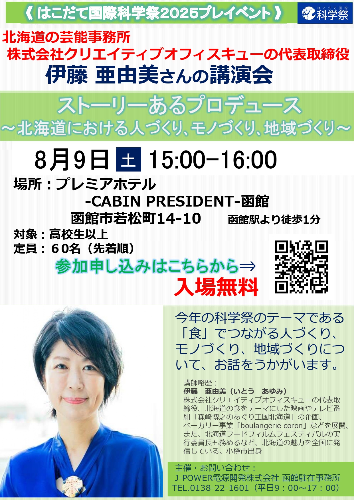 今年の科学祭のテーマ「食」に合わせて、北海道の芸能事務所 株式会社クリエイティブオフィスキューの代表取締役であり、食とコンテンツのプロデューサーとして北海道の魅力を全国に発信している伊藤亜由美さんから、「食」でつながる人づくり、モノづくり、地域づくりについて、お話をうかがいます。